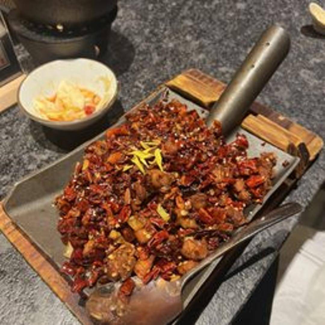 A bold and flavorful chicken dish prepared with a fiery blend of chili peppers and spices. Features tender chicken pieces cooked in a robust, spicy sauce, delivering a satisfying kick with every bite.