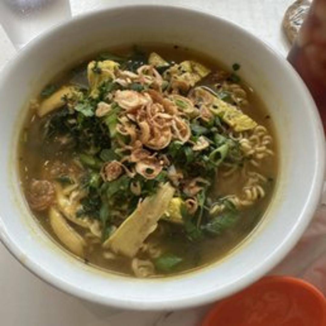 A comforting bowl of chicken-flavored Top Ramen noodles, enriched with shredded chicken, soft-boiled egg, and fresh herbs.
