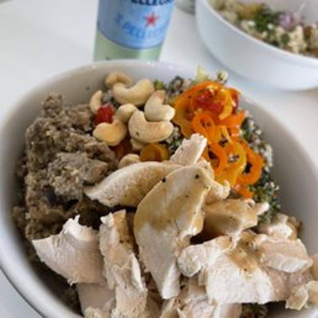A vibrant mix of fresh greens, assorted vegetables, toasted nuts, and a light vinaigrette dressing.