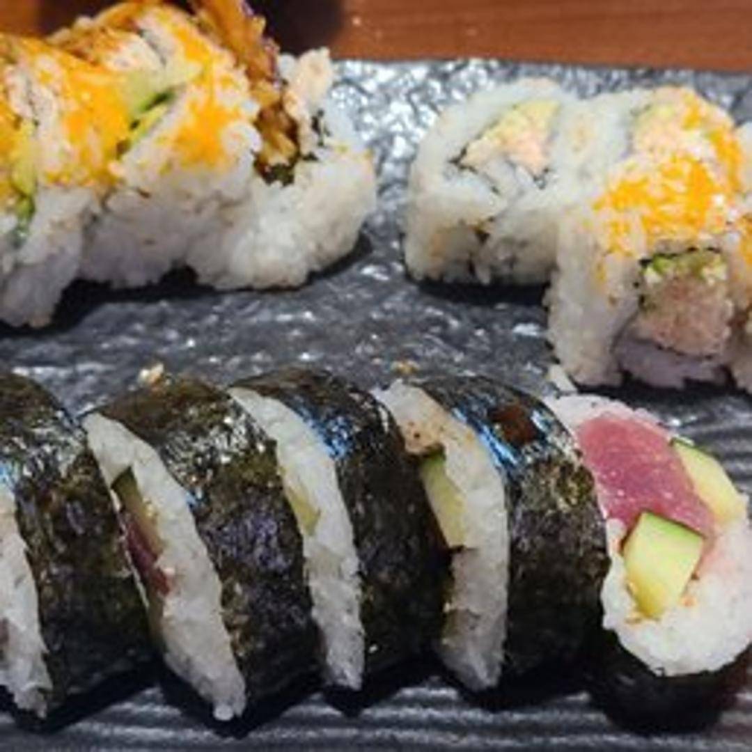 A classic sushi roll consisting of imitation crab meat, avocado, and cucumber, rolled in sushi rice and nori seaweed, and sprinkled with sesame seeds.
