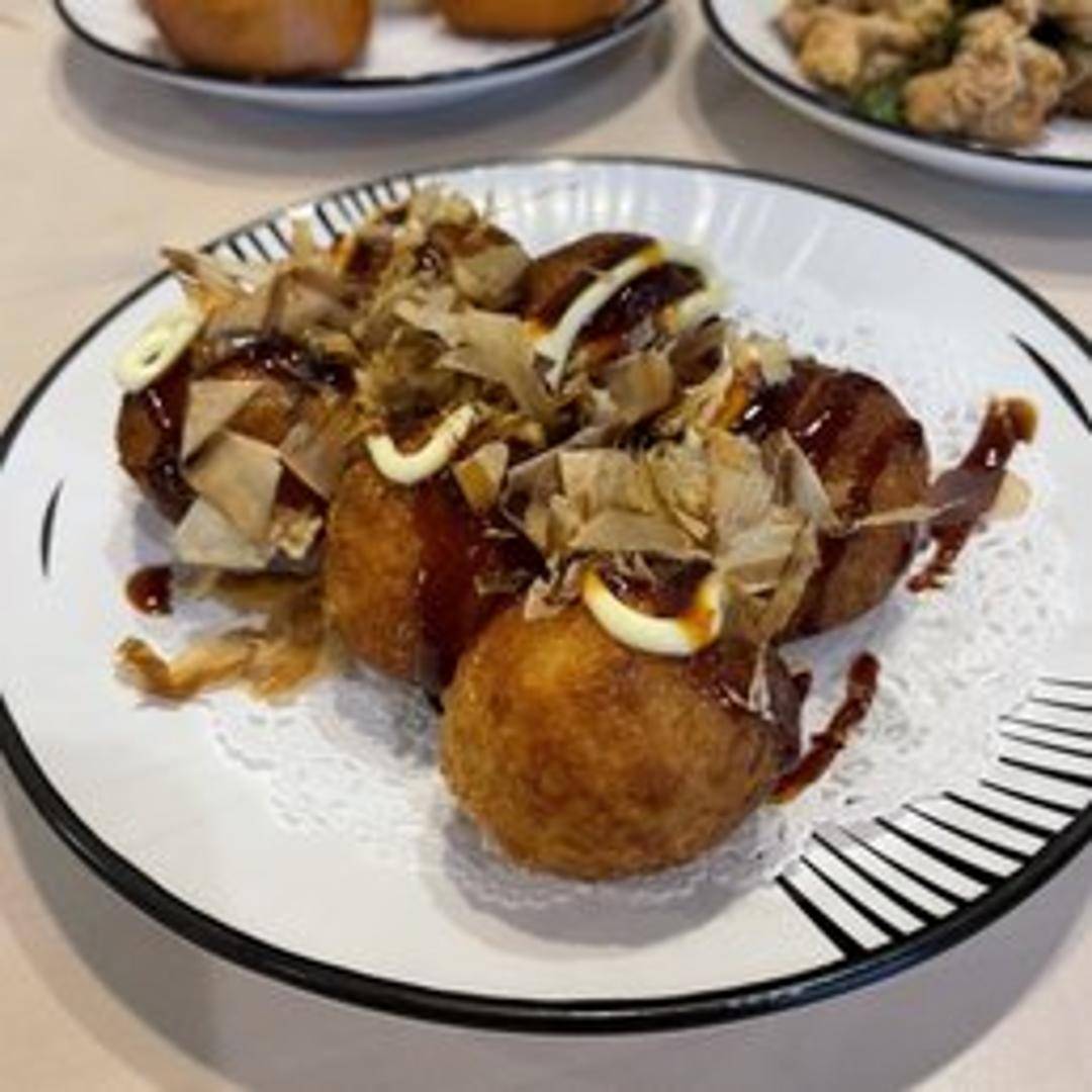 Savory Japanese street food consisting of ball-shaped octopus dumplings. Typically made with a wheat flour-based batter, filled with diced octopus, tempura scraps, pickled ginger, and green onion. Cooked in a special takoyaki pan and brushed with takoyaki sauce and mayonnaise. Often garnished with dried seaweed flakes (aonori) and shaved dried bonito (katsuobushi).
