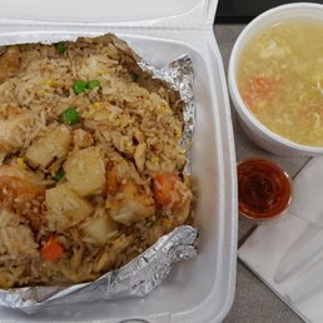 Fragrant and flavorful fried rice served in a half pineapple (when available). Prepared with rice, cashew nuts, raisins, peas, carrots, pineapple chunks, and your choice of chicken, pork, beef, shrimp, or tofu. Seasoned with a touch of curry powder and garnished with chopped cilantro.