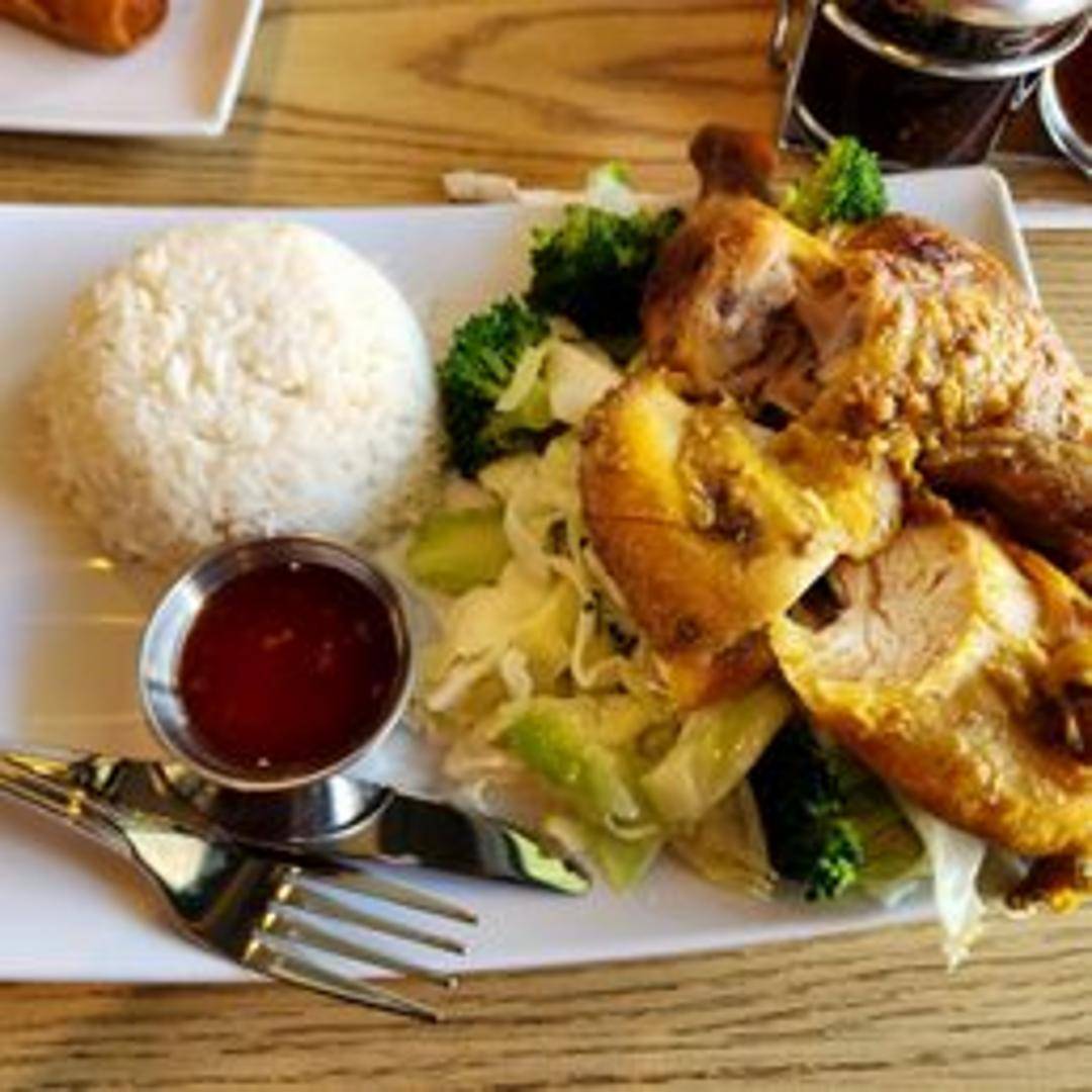 Grilled chicken marinated in a sweet and savory Thai BBQ sauce, served with steamed rice and a side of fresh vegetables. The chicken is tender and juicy, with a slightly smoky flavor complemented by the aromatic spices of Thai cuisine.
