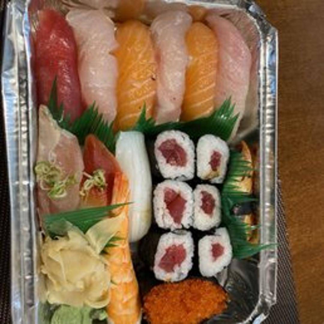 A chef's selection of assorted nigiri sushi. The specific types of fish and number of pieces may vary.
