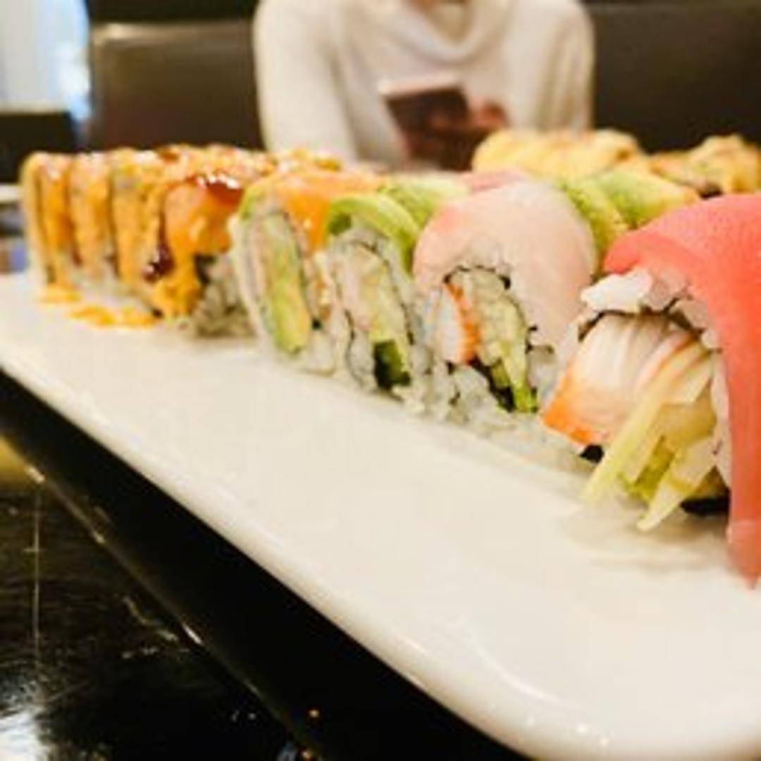 A vibrant and flavorful sushi roll, typically filled with crab stick, cucumber, and avocado, then beautifully topped with an array of fresh, thinly sliced fish such as tuna, salmon, and yellowtail, creating a stunning 'rainbow' effect and a medley of tastes.