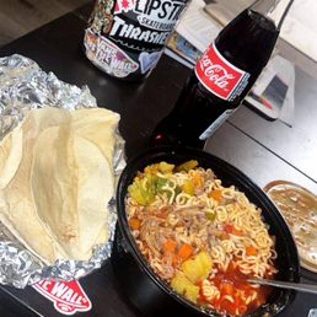 Savory and rich birria broth served with ramen noodles, tender shredded birria meat, cilantro, onions, and a lime wedge.