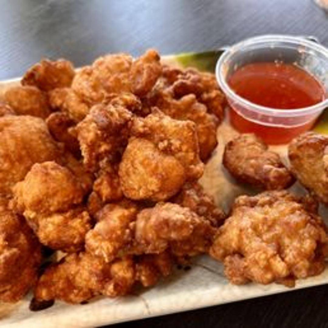 Japanese fried chicken marinated in soy sauce, ginger, and garlic, then coated in potato starch and deep-fried until crispy and golden brown. Served with a side of dipping sauce.