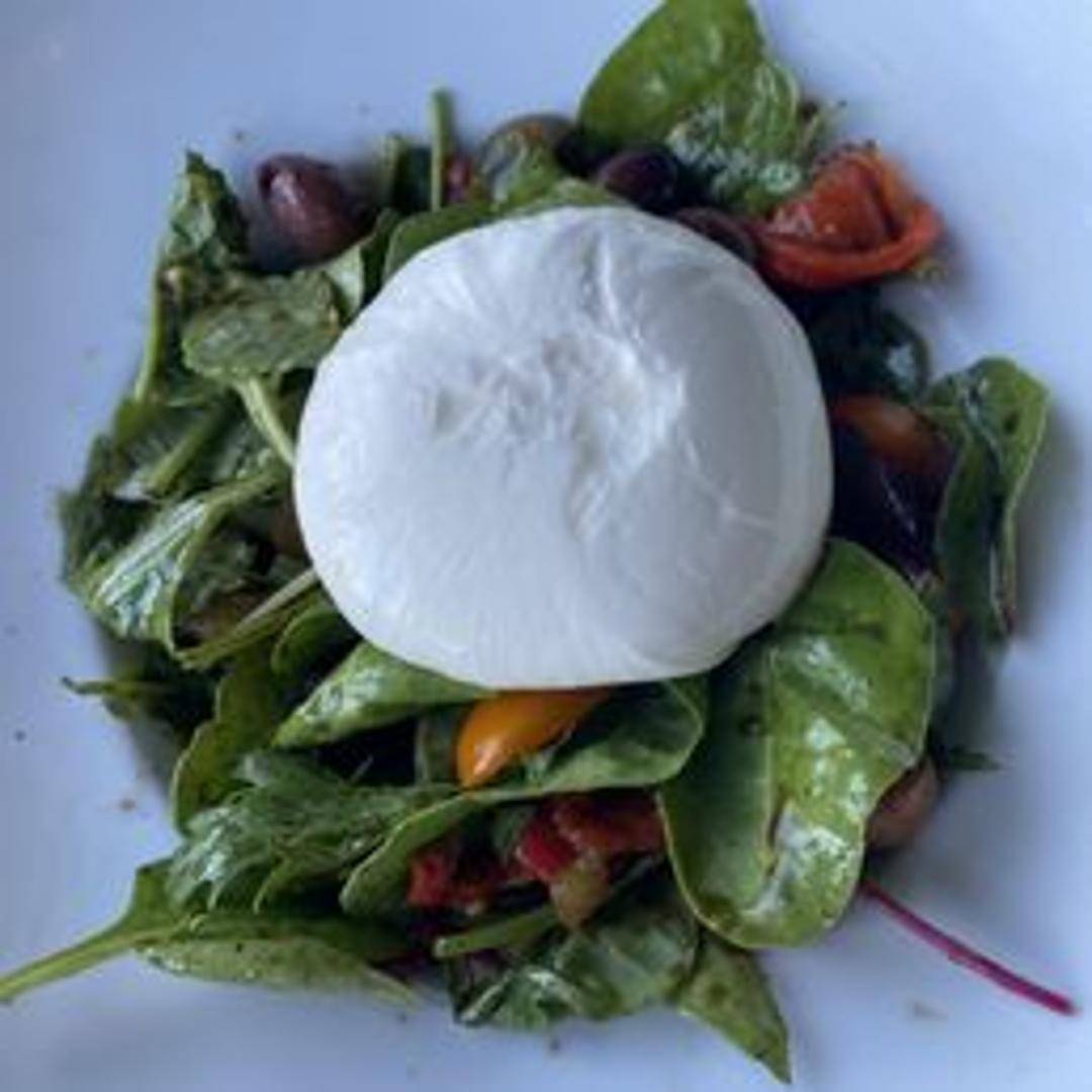A refreshing salad featuring a creamy, rich burrata cheese ball, served atop a bed of fresh mixed greens, ripe heirloom tomatoes, and fragrant basil leaves. Drizzled with a balsamic glaze and extra virgin olive oil, it's a light yet indulgent starter.