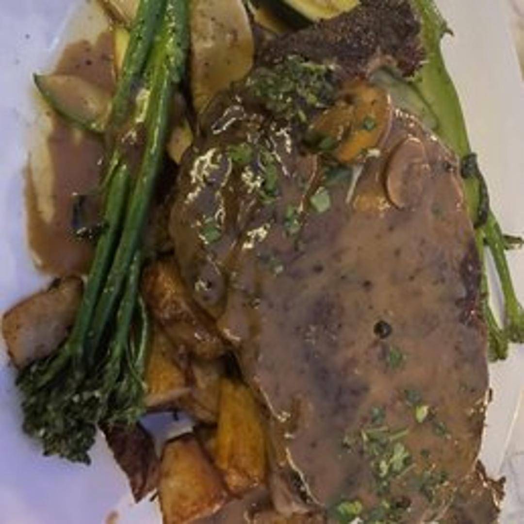 A prime cut of expertly aged ribeye steak, generously marbled for exceptional flavor and tenderness. Pan-seared to a perfect medium-rare, creating a beautifully caramelized crust while retaining a juicy, succulent interior. Seasoned simply with sea salt and cracked black pepper to highlight its natural richness, served with a delicate herb butter.