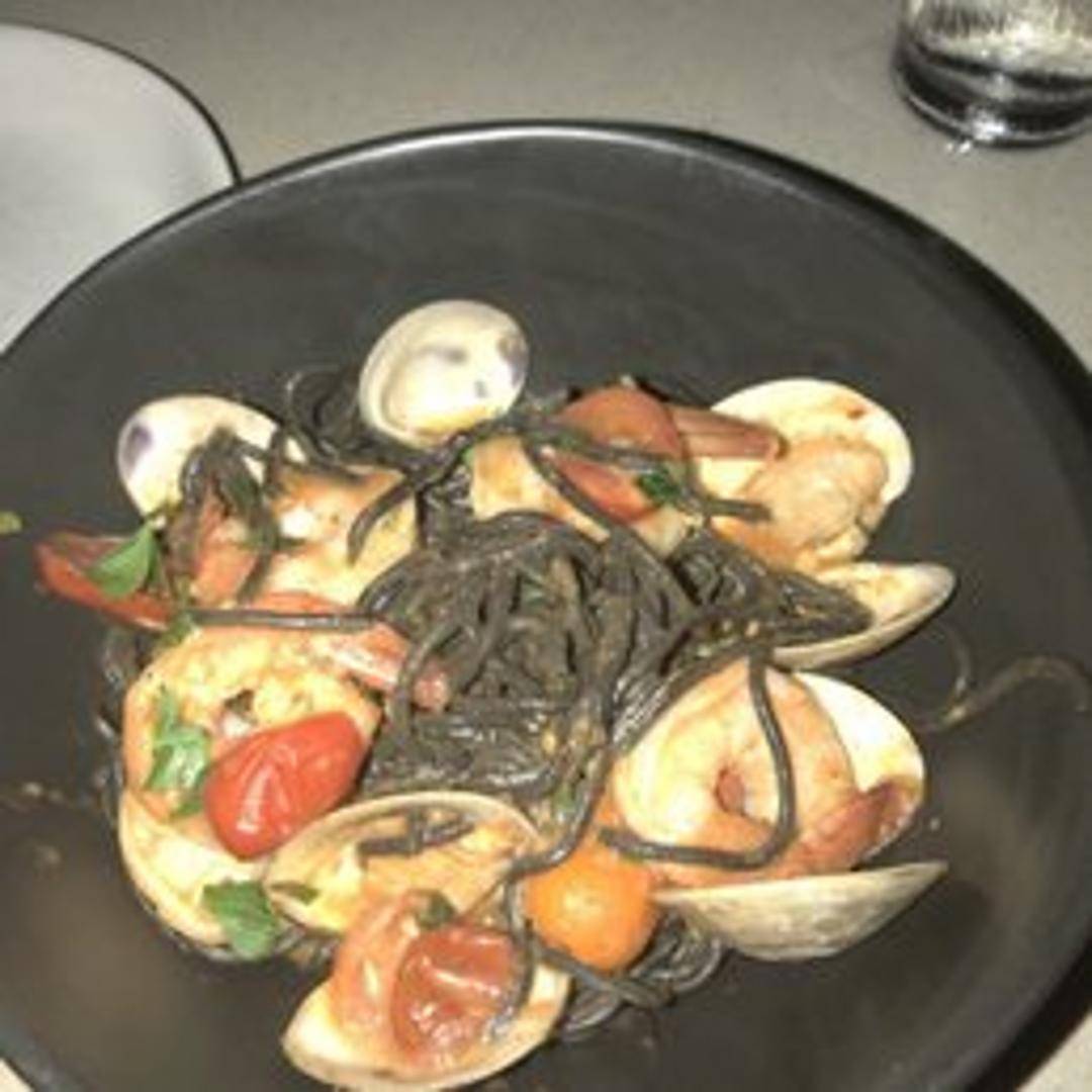 Strikingly black, house-made pasta infused with natural squid ink, offering a subtle, briny essence and unique visual appeal. This artisanal pasta provides an elegant base for seafood preparations, often served with a light garlic and white wine sauce, fresh cherry tomatoes, and a medley of pristine shellfish.