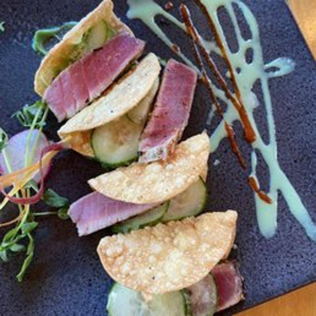 Seared Ahi tuna served in warm tortillas with a variety of toppings, such as slaw, avocado, and a spicy aioli.