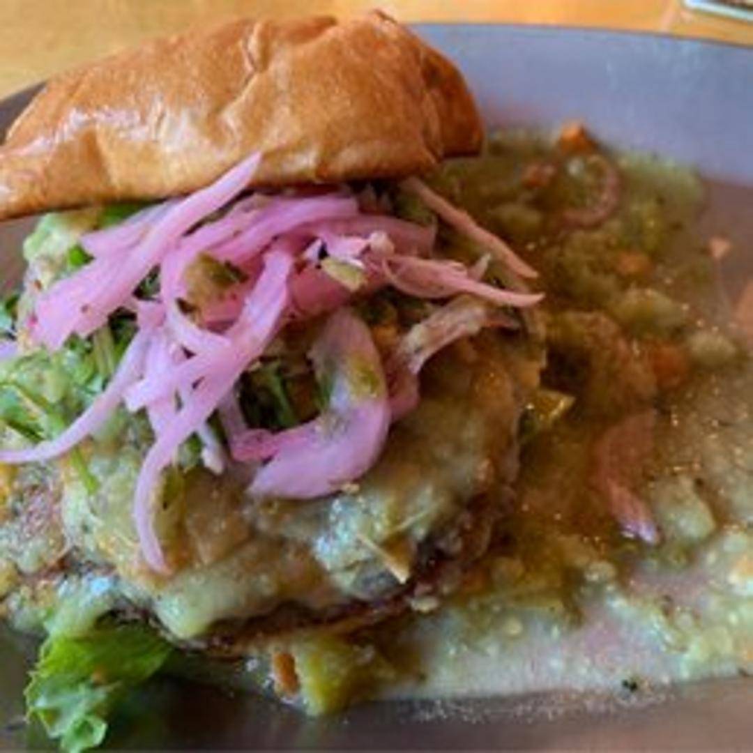 A burger featuring a patty nestled on a piece of fry bread, with typical burger toppings.