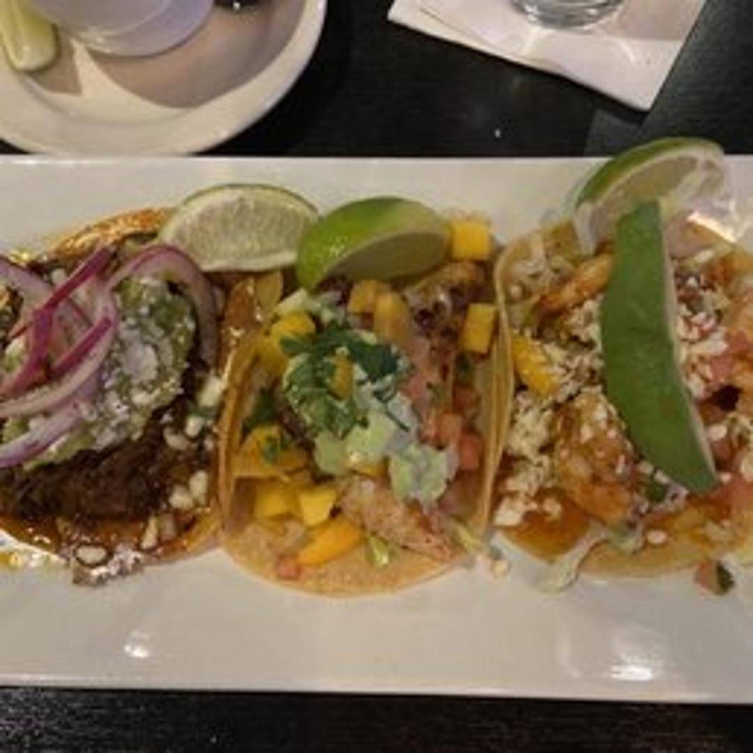 Grilled or blackened Mahi Mahi served in warm tortillas. Includes toppings such as shredded cabbage, pico de gallo, cilantro-lime crema, and a side of rice and beans.