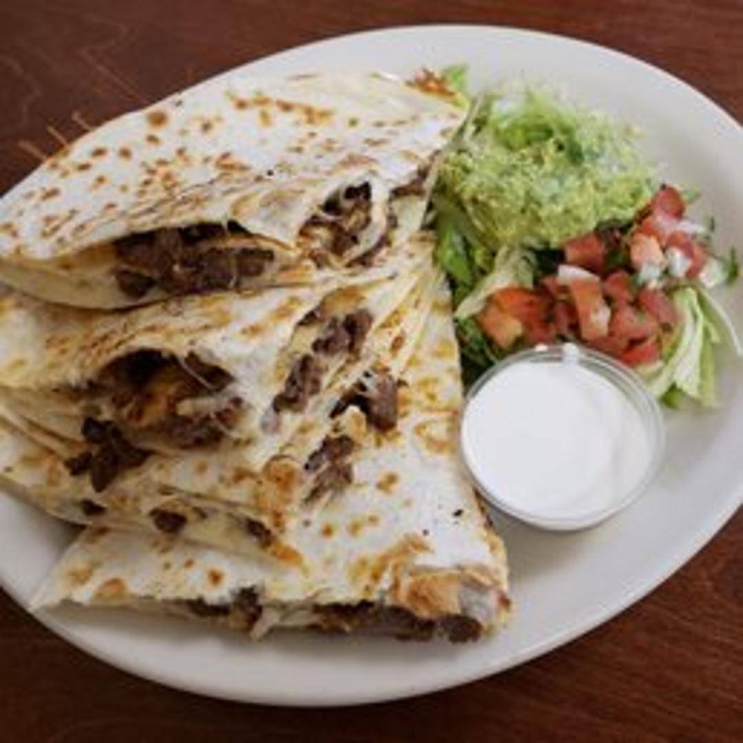 A generously sized quesadilla featuring grilled steak, melted cheese, and your choice of toppings and fillings folded between two crispy tortillas. Served with a side of your choice.