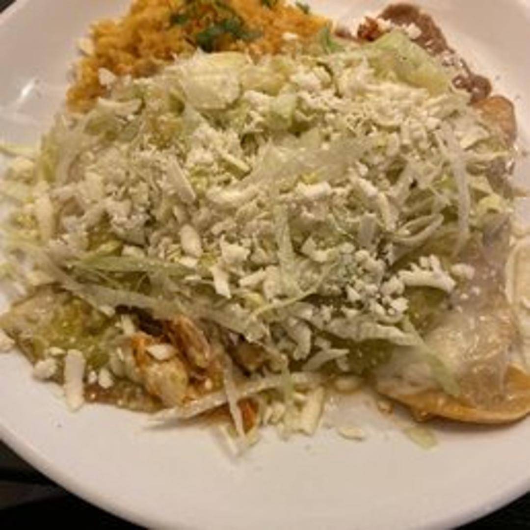 Savory enchiladas filled with shredded chicken simmered in a smoky and slightly spicy chipotle tinga sauce. Wrapped in corn tortillas and smothered in your choice of sauce (red, green, or mole), topped with melted cheese, sour cream, and onions. Served with a side of rice and beans.