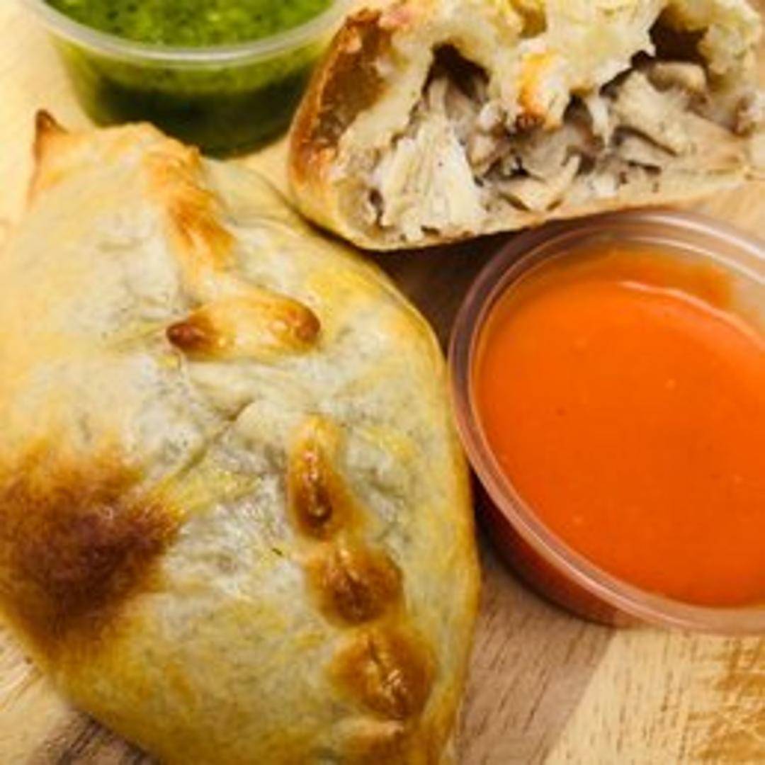 A flavorful empanada featuring a blend of fresh herbs and spicy serrano peppers. Baked in a flaky crust.