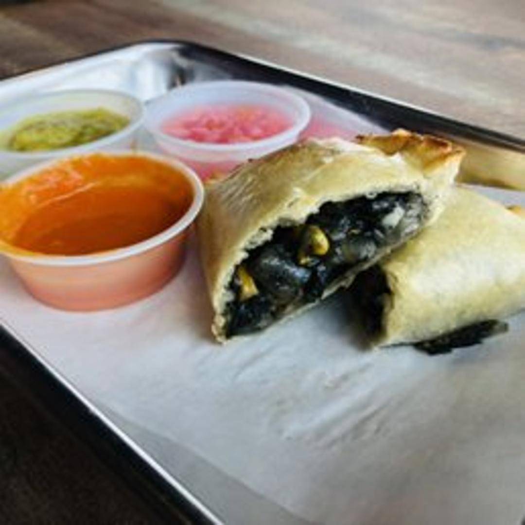 A savory empanada filled with cuitlacoche (corn smut), a traditional Mexican delicacy known for its earthy, mushroom-like flavor. Encased in a golden, flaky crust.