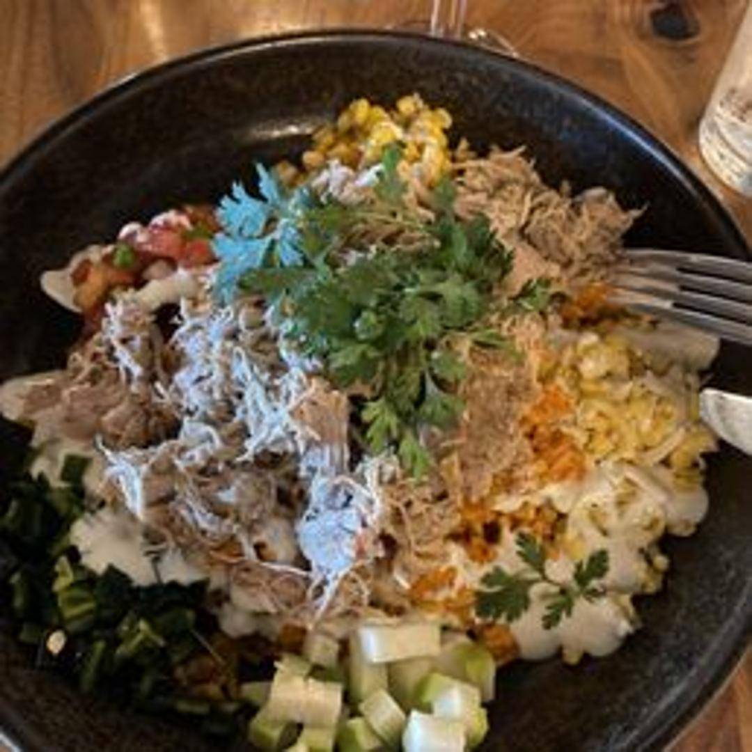 A light and healthy bowl featuring quinoa, kale, avocado, roasted sweet potatoes, pepitas, black beans and a green goddess dressing. (May contain nuts or seeds.)