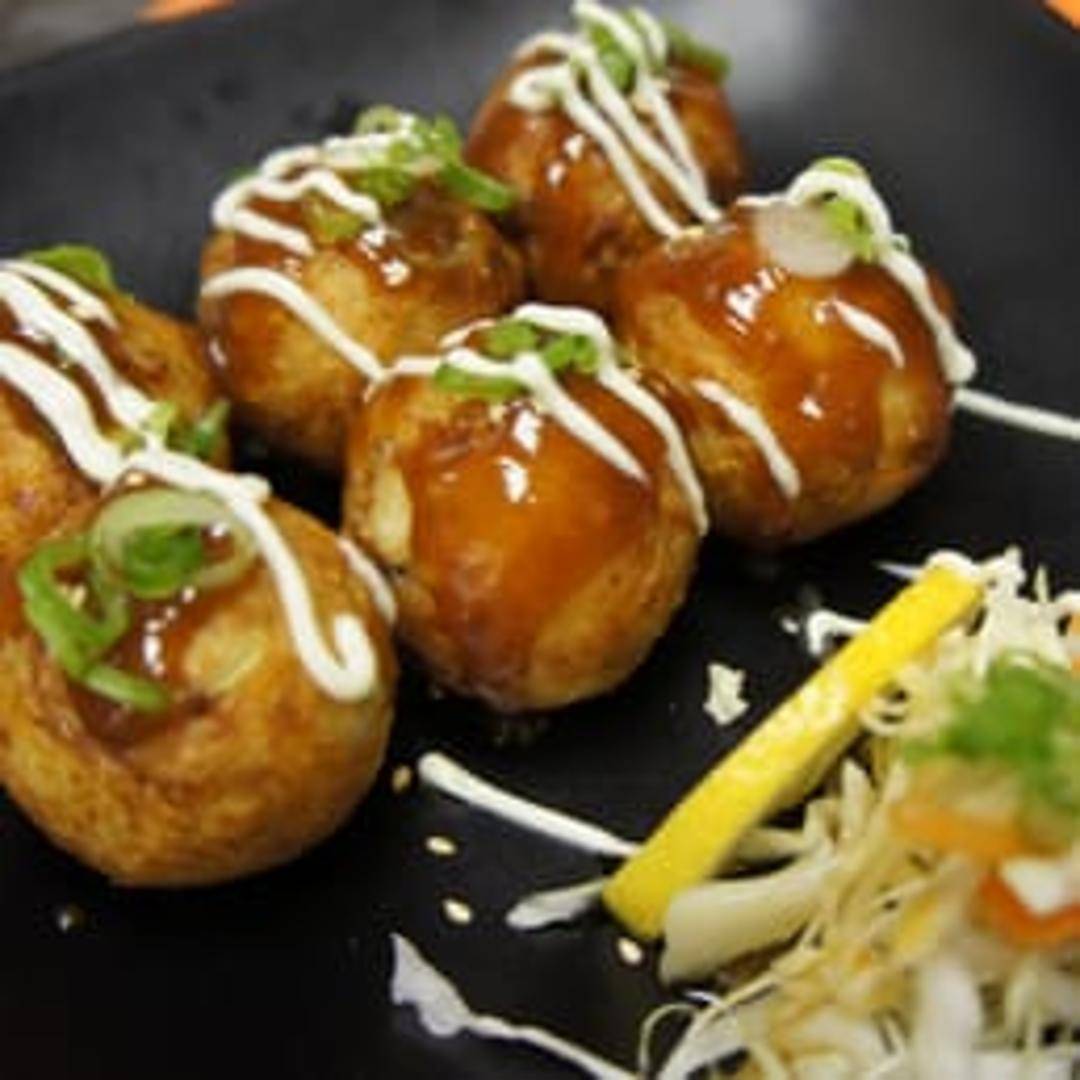 Deep-fried octopus balls topped with takoyaki sauce, mayonnaise, bonito flakes, and seaweed powder.
