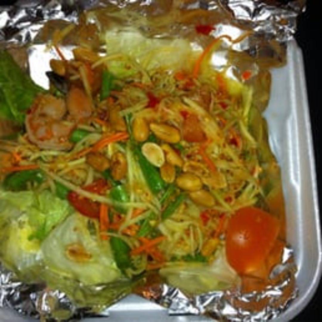 A spicy and refreshing salad made with shredded green papaya, tomatoes, green beans, carrots, garlic, chili peppers, fish sauce, lime juice, and peanuts. Choose your spice level.