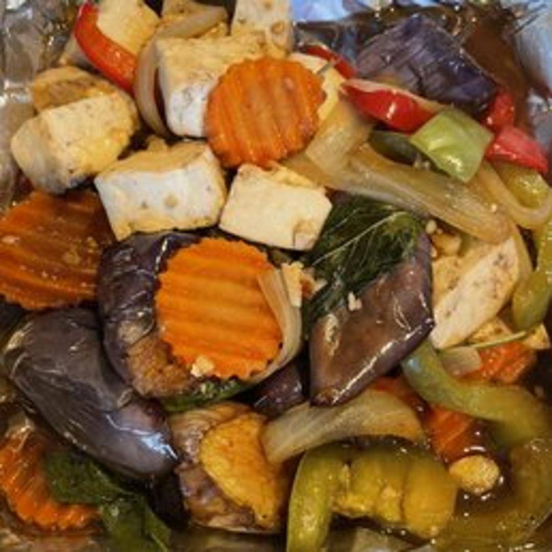 Sautéed eggplant stir-fried with fresh basil leaves, bell peppers, onions, and chili peppers in a savory and spicy sauce.
