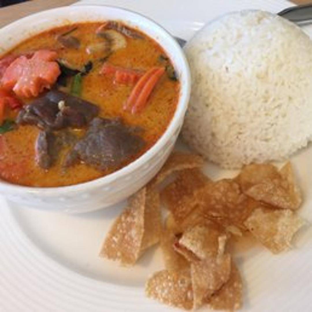 A rich and flavorful red curry cooked in coconut milk with Panang curry paste, bell peppers, green beans, and basil leaves. (Specify protein choice when ordering)
