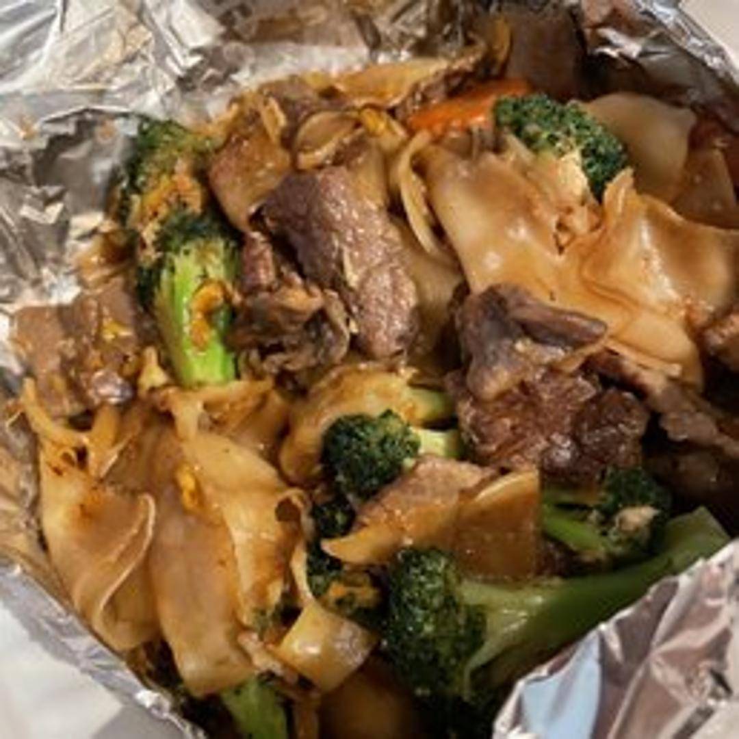 Stir-fried wide rice noodles with Chinese broccoli, egg, and your choice of protein (chicken, beef, pork, tofu, or vegetables) in a sweet and savory soy sauce based sauce.
