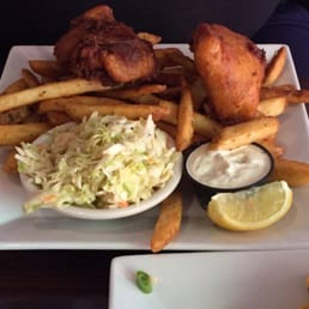 Battered and fried fish fillets served with french fries, tartar sauce, and lemon wedges.