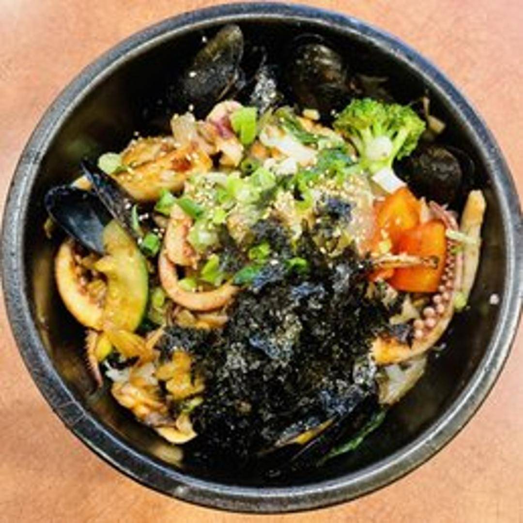 A vibrant and hearty dish served in a sizzling hot stone pot, ensuring a wonderfully crispy rice layer at the bottom. It features a colorful array of fresh and seasoned vegetables, a choice of protein (often beef or tofu), and a fried egg, all artfully arranged over warm rice. Mix it all together with a dollop of spicy gochujang sauce for a complete, flavorful experience.