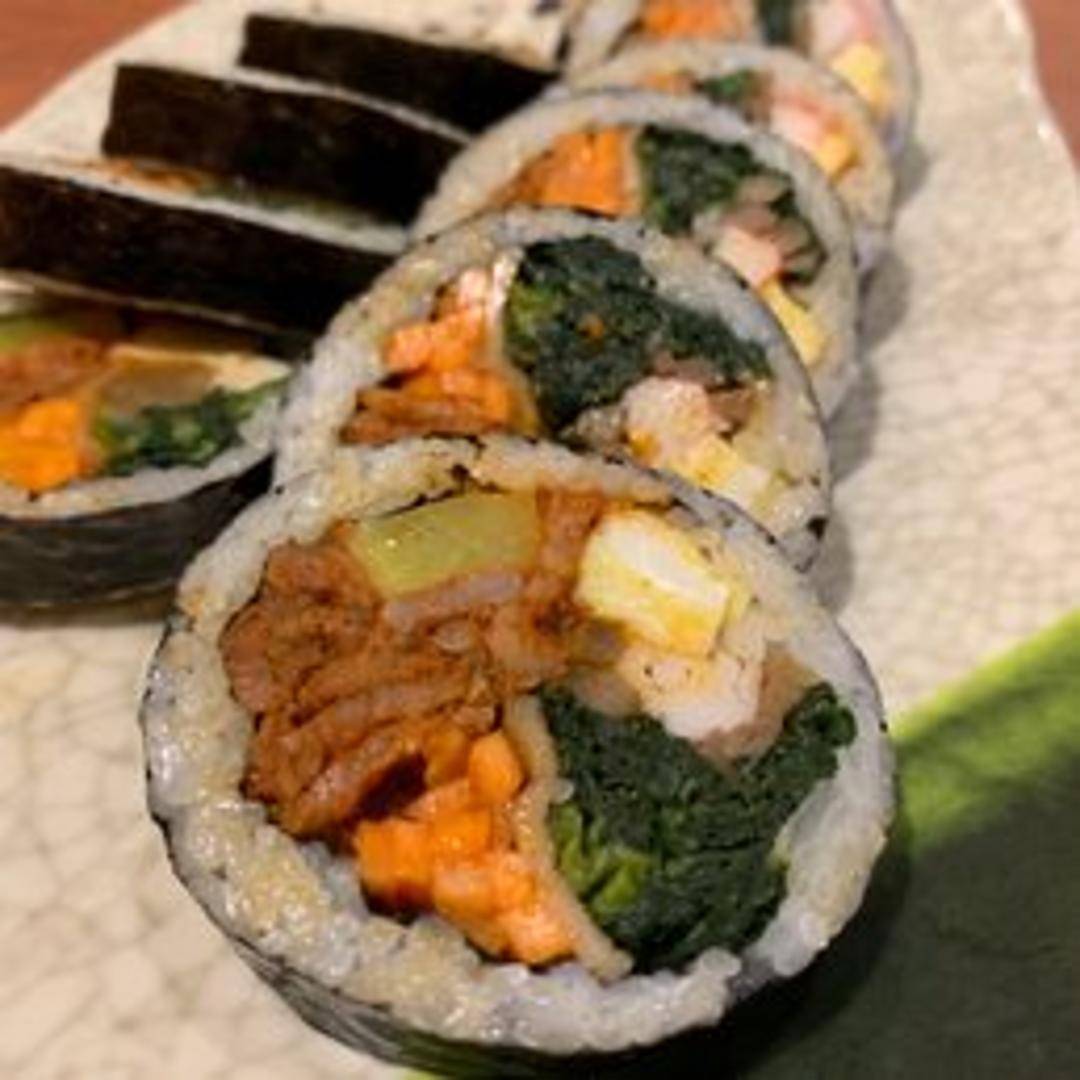 Experience a kick of flavor with this Korean seaweed rice roll featuring tender, spicy marinated pork. The fiery pork filling is balanced by the inclusion of fresh ingredients like crisp vegetables, pickled radish, and egg, all carefully rolled with seasoned rice within a sheet of roasted seaweed. Each slice delivers a satisfying blend of savory, spicy, and fresh tastes.