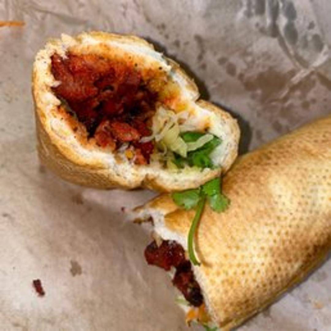 A flavorful sandwich featuring marinated and grilled BBQ pork, creating a sweet and savory combination.