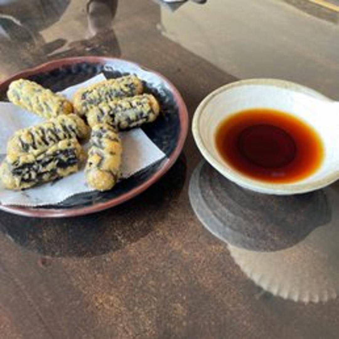 A unique fusion dish featuring Japchae (Korean glass noodles with stir-fried vegetables and meat) rolled in seaweed and lightly battered then deep-fried tempura style. Served with a dipping sauce.