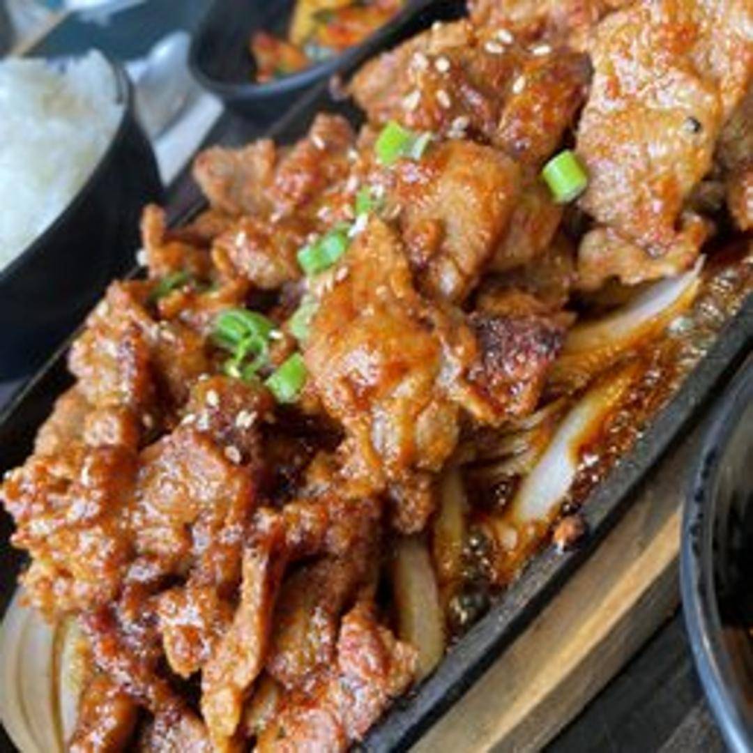Thinly sliced pork marinated in a spicy gochujang-based sauce, then grilled to perfection. Served with a side of rice and banchan (Korean side dishes).