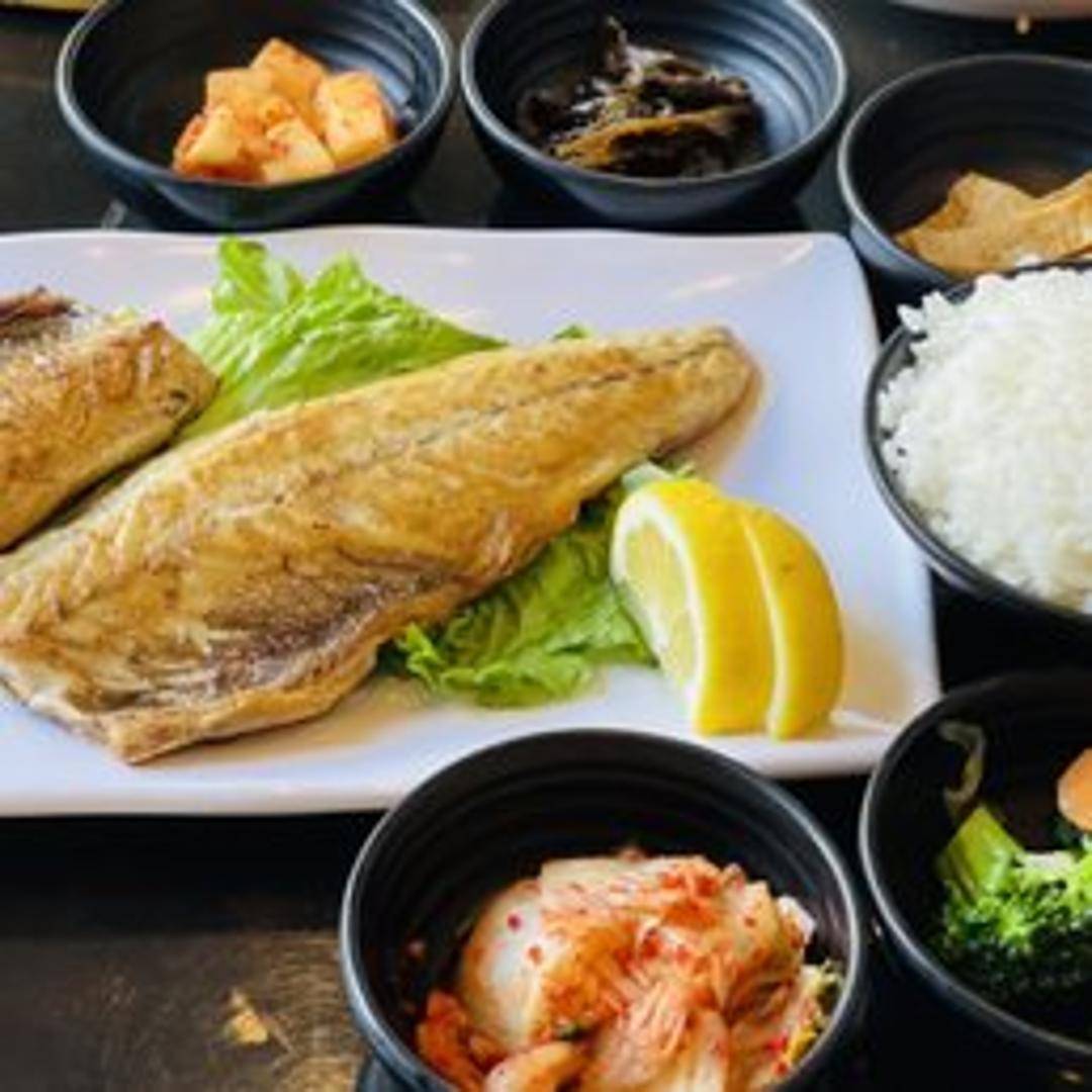 A whole mackerel, seasoned and expertly grilled to perfection. The skin is crispy, and the flesh is tender and flavorful. Served with a side of grated daikon radish and lemon.