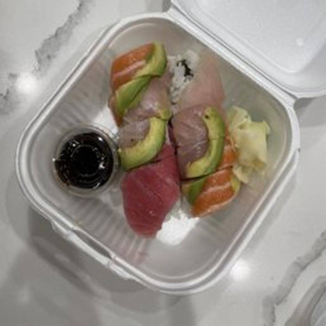 Crab mix and cucumber inside, topped with assorted fish (tuna, salmon, white fish, shrimp) and avocado.