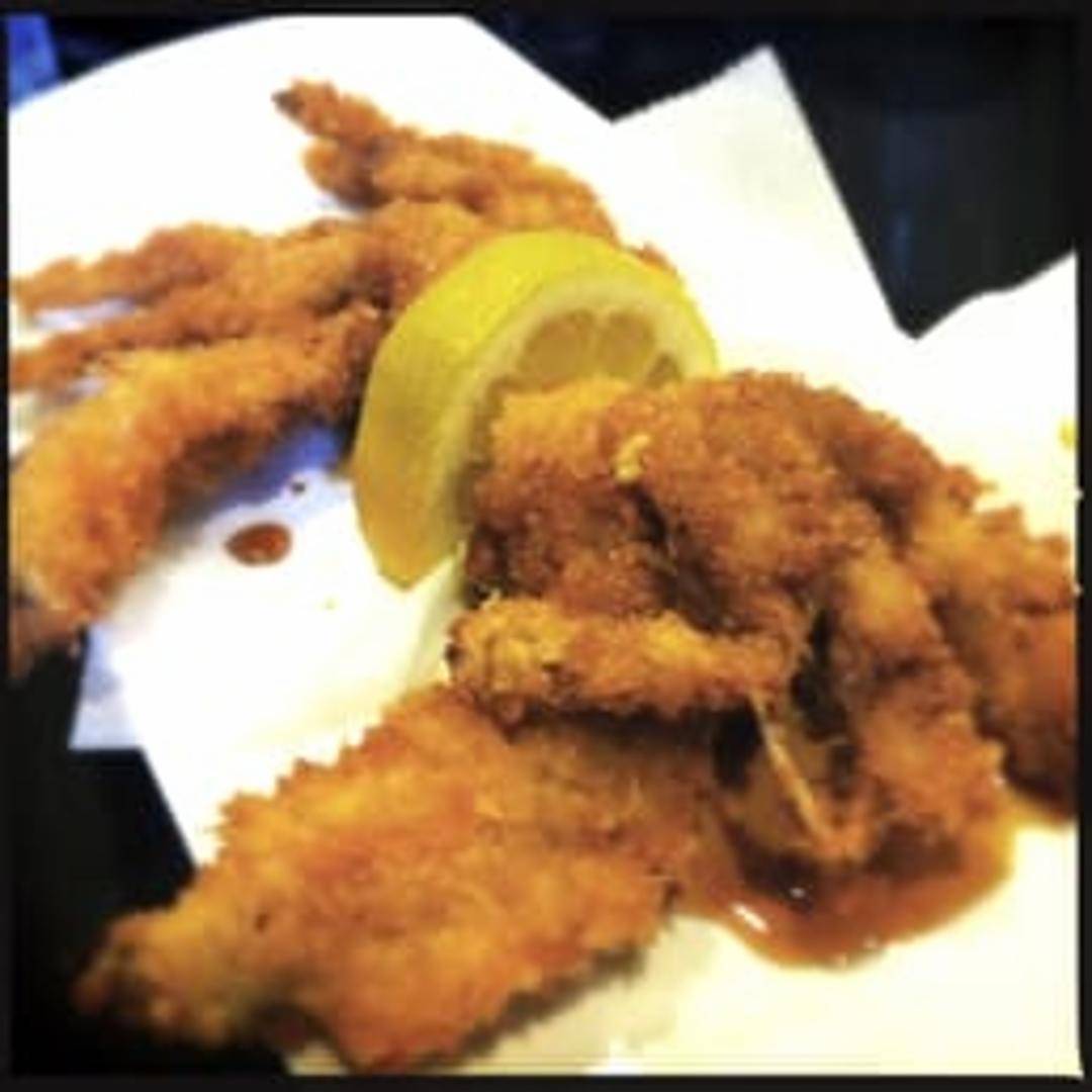Deep-fried soft shell crab, typically served with ponzu sauce or a similar dipping sauce. May include garnishes like daikon radish and lemon.