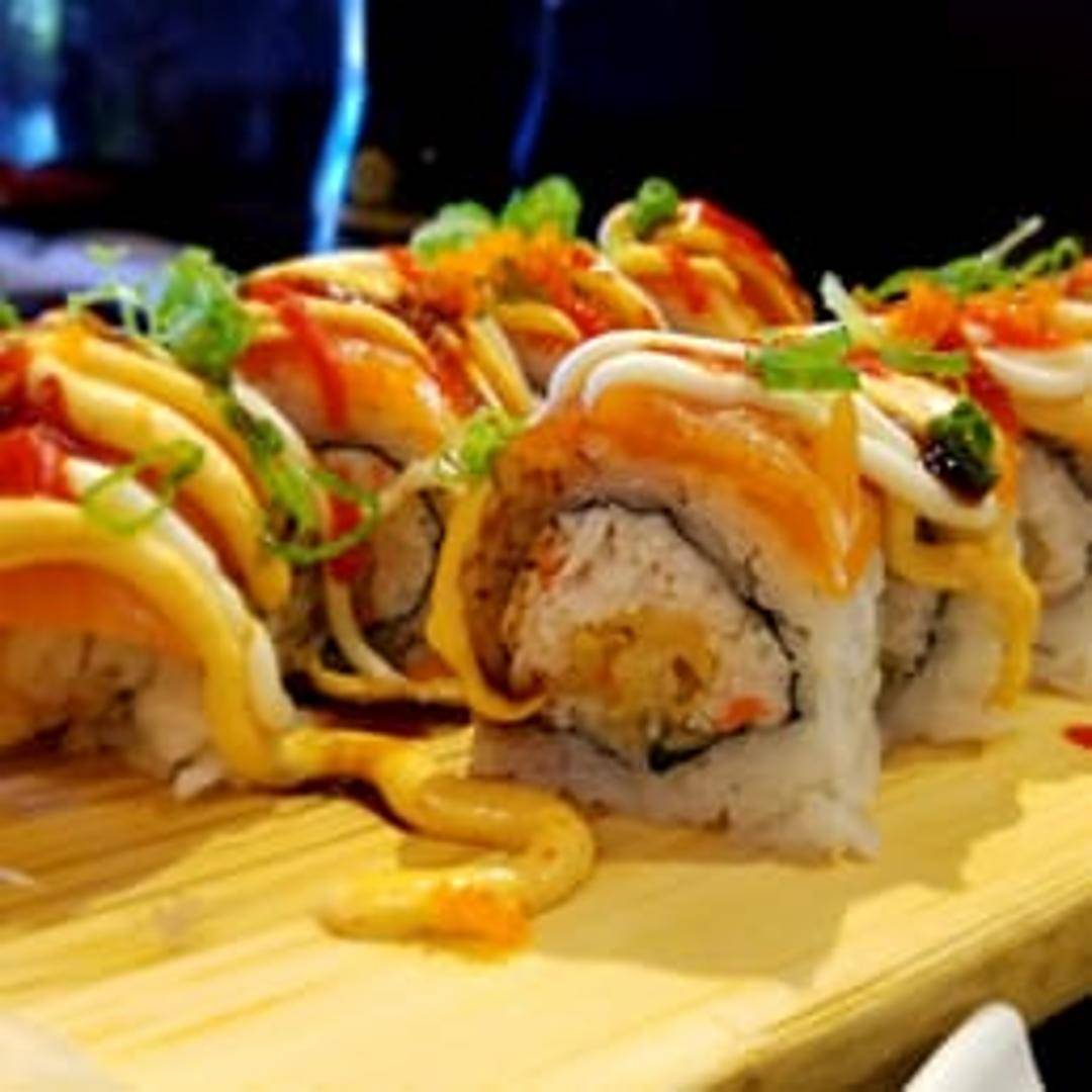 Spicy tuna, cucumber, avocado, topped with salmon, lemon slices, and masago. Served with spicy mayo and eel sauce.