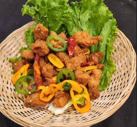 Diced chicken stir-fried with Szechuan peppercorns, chili peppers, and vegetables in a spicy and savory sauce.