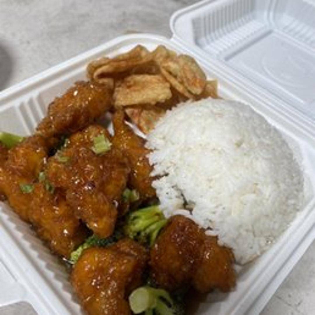 Crispy, bite-sized chicken pieces coated in a sweet and tangy General Tso's sauce, served with steamed rice.
