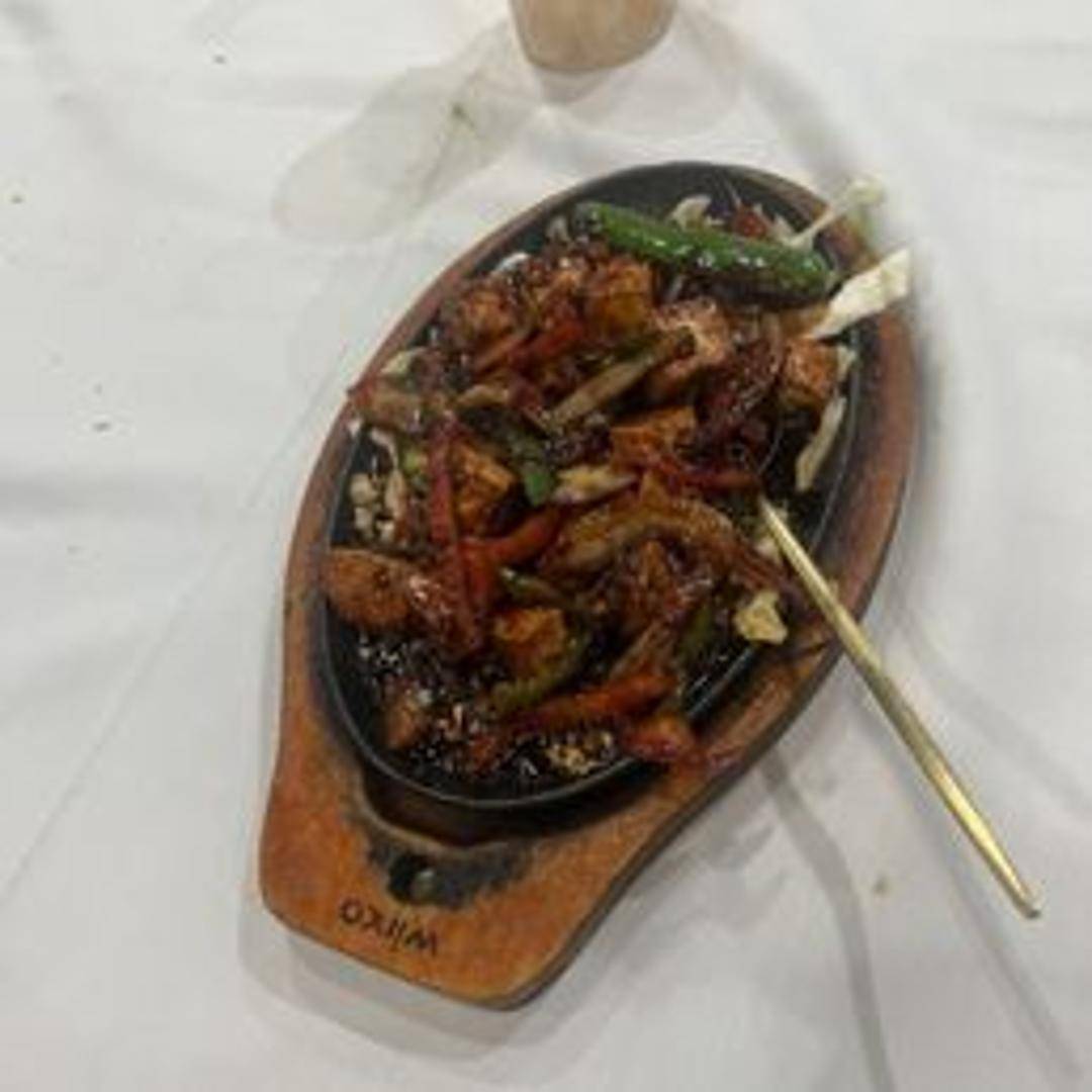 Cubes of paneer (Indian cheese) cooked in a spicy and savory chili sauce with bell peppers, onions, and a blend of Indo-Chinese seasonings.
