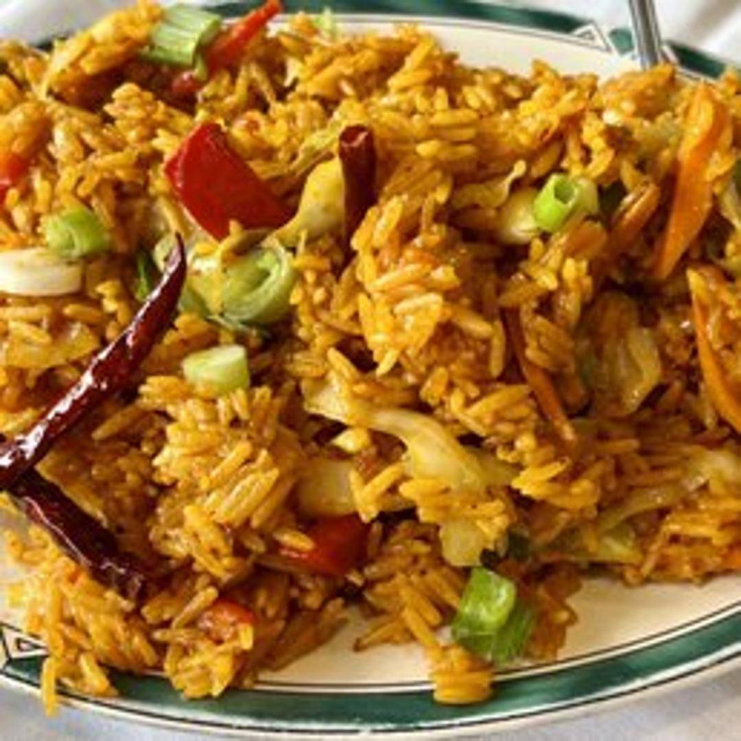 Fragrant fried rice cooked with garlic, chili peppers, vegetables, and your choice of protein, seasoned with soy sauce and other Indo-Chinese spices.