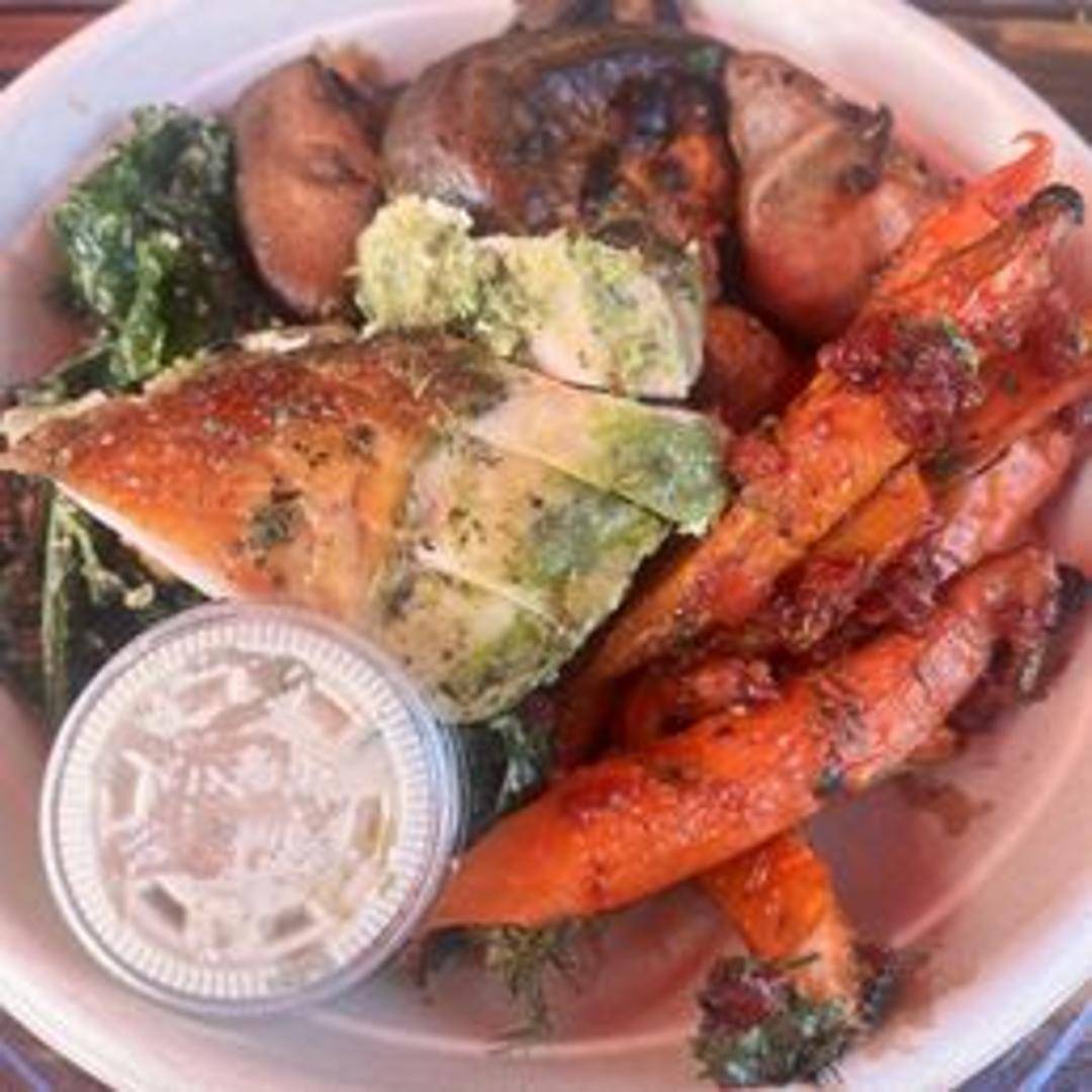 A wholesome and flavorful bowl featuring tender, herb-brined natural chicken breast. Prepared with fresh herbs and spices. Ingredients and sides may vary depending on seasonal availability.
