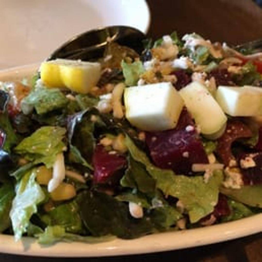 A refreshing and vibrant salad featuring a medley of finely chopped seasonal vegetables such as romaine lettuce, cucumbers, tomatoes, bell peppers, red onion, and Kalamata olives. Tossed in a light and tangy vinaigrette dressing and topped with crumbled feta cheese.