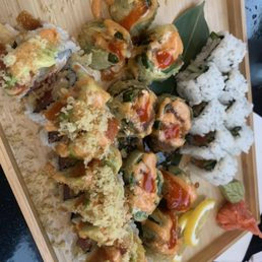 Shrimp tempura, crab, and cucumber roll topped with avocado, eel sauce, and spicy mayo.