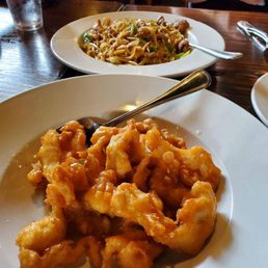 Crispy, battered chicken pieces coated in a sweet and tangy orange-flavored sauce. Served with steamed rice.