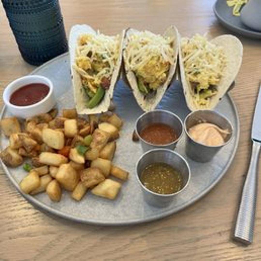 Scrambled eggs, chorizo, cheddar cheese, pico de gallo, and avocado crema in warm flour tortillas. Served with a side of salsa.