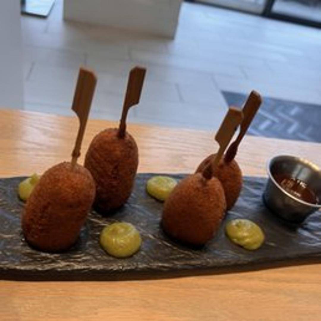 Crispy, golden-brown corndogs filled with succulent lobster meat, offering a delightful twist on a classic fairground favorite. Served with a tangy dipping sauce.