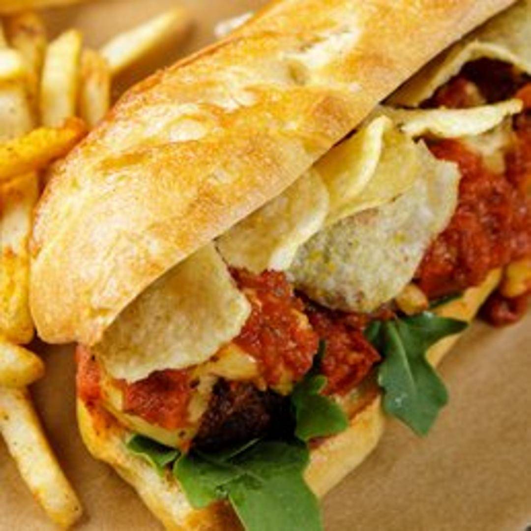 Plant-based meatballs smothered in marinara sauce and melted mozzarella cheese on a toasted hoagie roll. Served with your choice of side.