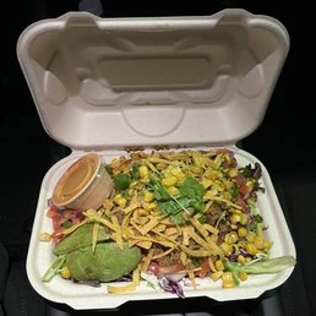 Crisp romaine lettuce topped with seasoned plant-based crumbles, black beans, pico de gallo, guacamole, cashew crema, and crispy tortilla strips, served in a crispy tortilla shell.