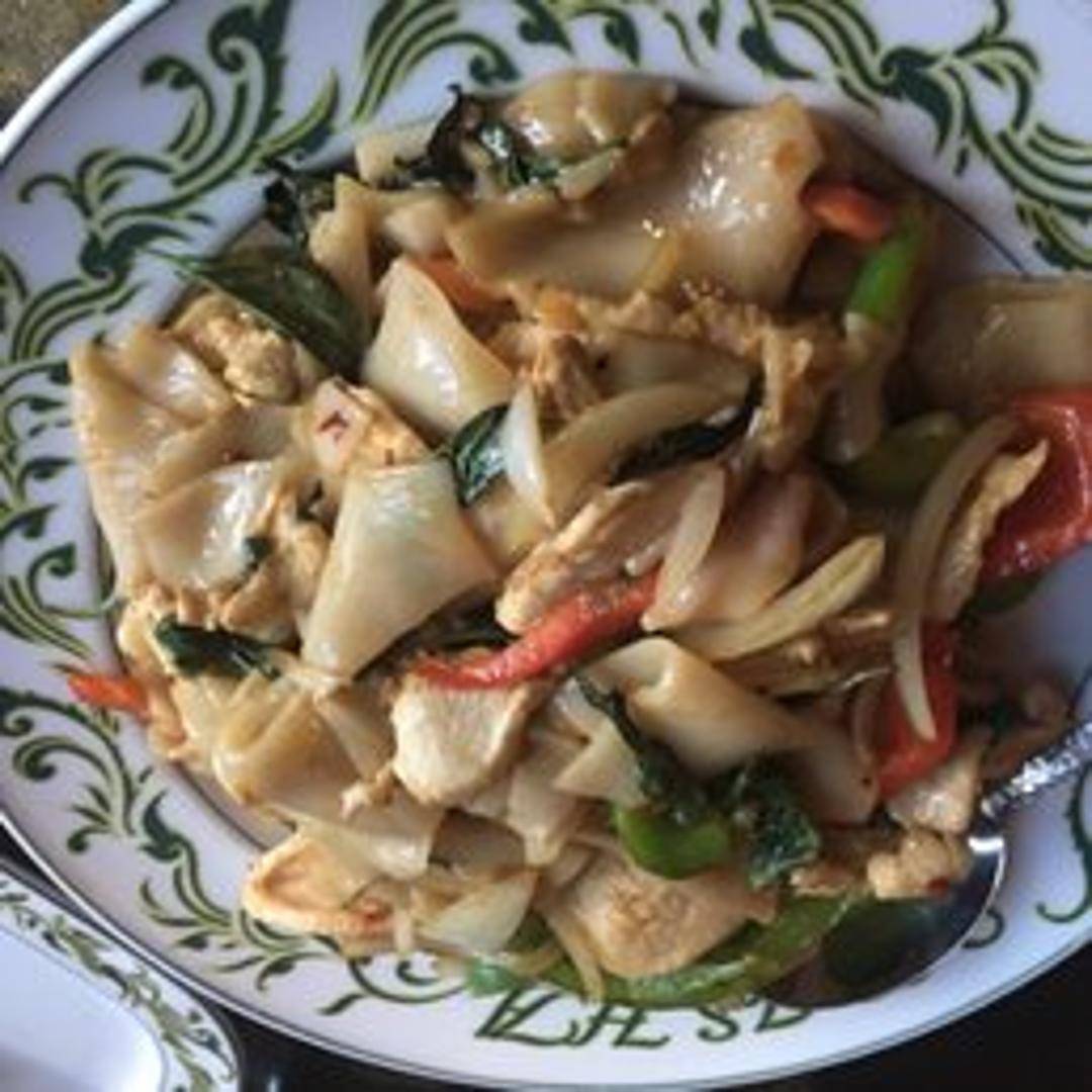 A popular Thai stir-fried noodle dish, also known as Pad Kee Mao, featuring wide rice noodles tossed with a savory and spicy sauce. It typically includes a choice of protein (such as chicken, beef, or shrimp), fresh vegetables like bell peppers, onions, and carrots, and is distinctively flavored with fresh chilies and Thai basil. The robust blend of flavors creates a fragrant and satisfying culinary experience.